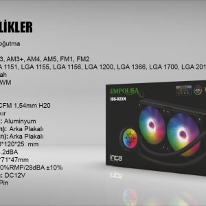 Sessiz çalışma, dayanıklı pompa ve boru sistemi, kolay montaj ve overclock desteği sayesinde hem oyun hem de profesyonel kullanım için ideal bir çözüm sunar. Eğer siz de LGA1700 / AM4 / AM5 uyumlu, 240 mm radyatörlü, ARGB aydınlatmalı ve yüksek performanslı sıvı soğutma arıyorsanız, INCA ISS-02XN, sisteminizi hem serin hem de şık tutacak güvenilir bir tercihtir.